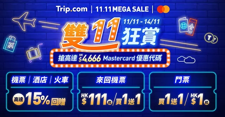 Trip.com一連四日推出萬眾期待的雙11狂賞優惠,由11月11日起至11月14日,每日定時發放各種優惠,包括機票及酒店優惠高達HK$1,111、預訂機票、酒店及高鐵可享高達15% Trip Coins回贈、限量一口價來回連稅機票HK$111起及買一送一優惠、以及交通、門票及體驗限時快閃優惠等。優惠數量有限,萬勿錯過! 限量機票及酒店優惠代碼,以Mastercard預訂滿HK$2,000即減HK$1,111 由11月11日至14日活動期間,每日凌晨12時發放機票或酒店優惠代碼,以Mastercard預訂機票或酒店滿HK$2,000即減 HK$1,111,或滿HK$1,000即減 HK$500!11月11日更有優惠加碼,中午12時將加推酒店優惠代碼,以Mastercard預訂酒店滿HK$1,000即減 HK$500! 機票優惠代碼亦會加碼!由11月11日至14日活動期間,每日晚上9時正將推出指定目的地機票優惠代碼,以Mastercard 預訂由香港或澳門出發至以下目的地之航班,滿HK$500即減 HK$111!另外亦有商務艙優惠代碼同時發放,11月11日及12日晚上9時正開搶,預訂商務艙機票滿HK$4,888即減HK$888,名額每日33個,立即為您的旅程升級! 另外,World Mastercard信用卡優惠代碼亦會於11月11日凌晨12時開放使用,直至11月14日,預訂機票滿HK$3,000減 HK$200 / 滿HK$4,500 減 HK$300 優惠;預訂酒店滿HK$3,000 減 HK$200,名額有限,先用先得。 預訂機票、酒店及高鐵可享高達15% Trip Coins回贈 Trip.com於11月11日至14日活動期間推出限時Trip Coins回贈優惠,預訂機票、酒店及高鐵可享高達15% Trip Coins回贈。 Trip.com更推出限定Trip Coins加碼回贈,於11月11日至14日期間預訂香港或澳門出發來往指定目的地包括哈爾濱、名古屋、福岡、札幌及三亞的機票及當地酒店,可獲高達額外1,999 Trip Coins(約HK$156)! 限量一口價來回機票連稅HK$111起 由11月11日至14日活動期間,每日晚上9時正或9時30分準時開搶限量一口價來回連稅機票,包括香港來回東京、福岡、曼谷、墨爾本、台北、悉尼、上海以及成都航線,出發日期由當日至2026年2月28日,一口價價格由HK$111起,已包含所有稅項及附加費,每個目的地名額20個。 門票及體驗限時快閃優惠 由11月11日至14日活動期間推出限量優惠,每日中午12時準時開搶! 火車、旅行團、機場接送、郵輪及租車優惠 11月11日及14日每日凌晨12時開搶高鐵優惠券,買滿HK$74即減HK$73,名額100個;以及買滿HK$100即減HK$20,名額300個。 另外,由11月11日凌晨12時起開搶各類交通優惠券,包括旅行團及私人旅行團半價優惠券及9折優惠券、機場接送半價、7折以及92折優惠券、郵輪優惠券滿HK$6,999即減HK$299、海外郵輪優惠券滿HK$9,999即減HK$699、租車半價及92折優惠券。種類繁多,總能滿足您的需要! 以上各項優惠受條款及細則約束,有關詳情請參閱活動界面。