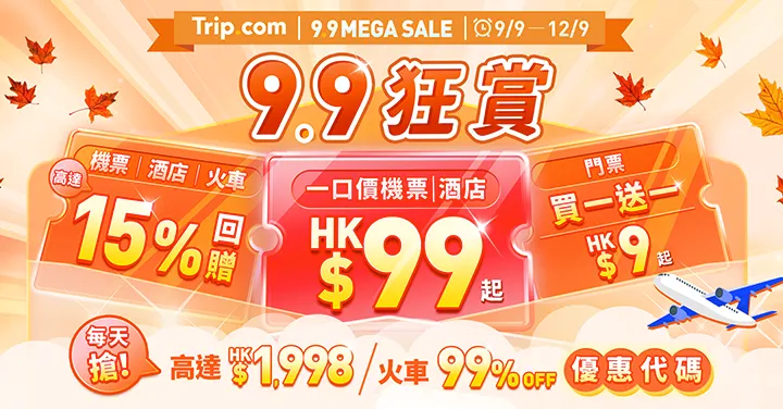Trip.com一連四日推出狂賞優惠,由9月9日起至9月12日,每日定時發放各種優惠,包括機票及酒店優惠高達HK$1,998、預訂機票、酒店及高鐵可享高達15% Trip Coins回贈、限量一口價來回連稅機票HK$99起、限量一口價酒店優惠、門票及體驗限時快閃優惠等。優惠數量有限,Trip.com會員切勿錯過! 詳情請參閱Trip.com 9.9狂賞優惠活動頁面: https://hk.trip.com/sale/w/13505/2025-99megasale.html 機票及酒店優惠代碼,滿HK$1,500即減HK$999 由9月9日至12日活動期間,每日凌晨12時發放機票或酒店優惠代碼,預訂機票或酒店滿HK$1,500即減HK$999,或滿HK$1,000即減HK$599! 機票優惠代碼今次將會加碼!由9月9日至12日活動期間,每日晚上9時30分將推出指定目的地機票優惠代碼,預訂由香港或澳門出發至以下目的地之航班,滿HK$500即減HK$99! 另外,World Mastercard信用卡優惠代碼亦會於9月9日凌晨12時開放使用,直至9月12日,預訂機票滿HK$3,000減HK$200 /滿HK$4,500減HK$300優惠;預訂酒店滿HK$3,000減HK$200,名額有限,先用先得。預訂機票、酒店及高鐵可享高達15% Trip Coins回贈 Trip.com於9月9日至12日活動期間推出限時Trip Coins回贈優惠,預訂機票、酒店及高鐵可享高達15% Trip Coins回贈。 限量一口價來回機票連稅HK$99起 由9月9日至12日活動期間,每日晚上9時正準時開搶限量一口價來回連稅機票,包括香港來回台北、高雄、曼谷、大阪、札幌以及哈爾濱航線,出發日期由當日至12月31日,一口價價格由HK$99起,已包含所有稅項及附加費。 限量一口價酒店優惠 9月9日至12日活動期間每日中午12時正準時開搶一口價酒店優惠,以HK$99起預訂台北、泰國及中國內地的指定酒店。 高鐵限時優惠券、歐洲及英國火車優惠 由9月9日至11日活動期間,每日凌晨12時起開搶高鐵八折優惠券,折扣金額上限為HK$100,每日名額50個,以及高鐵HK$100減HK$15優惠券,每日名額200個。9月12日亦有高鐵HK$100減HK$15優惠券開搶,名額更高達600個! 另外,9月9日至12日活動期間亦有歐洲及英國火車半價優惠券,折扣金額上限為HK$109。9月12日亦有歐洲及英國火車4%即時優惠,能夠與其他優惠券同時使用。 門票及體驗限時快閃優惠 由9月9日至12日活動期間推出限量優惠,每日中午12時準時開搶! 另外,全球最大規模的室內滑雪場「深圳華發冰雪熱雪奇蹟」將於9月29日正式開業,門票將於9月13日進行預售,9月6日至12日期間Trip.com將發放獨家HK$42優惠券,記得預先領取優惠券,預售期間就能搶先以優惠價購買套票。 以上各項優惠受條款及細則約束,有關詳情請參閱活動界面
